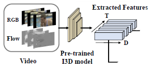 위 그림처럼 I3D backbone을 통해 RGB와 Optical flow feature인 X_{r} \in{} \mathbb{R}^{\mathcal{T} \times{} 1024}와 X_{f} \in{} \mathbb{R}^{\mathcal{T} \times{} 1024}를 추출합니다. 추출한 비디오 feature에 대한 분류와 localization을 통해 \{c_{i}, s_{i}, e_{i}, {conf}_{i}\}를 예측하게 됩니다. 각각은 예측한 클래스, 구간 시작 지점, 끝 지점, confidence score에 해당합니다.