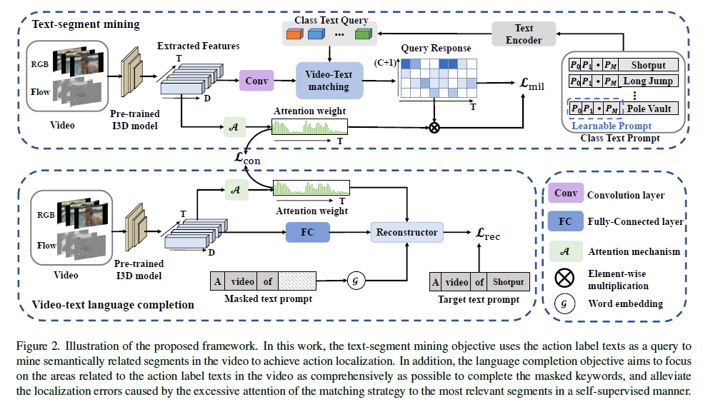 - To leverage text information, we devise two objective: the discriminative objective to enlarge the inter-class difference, thus reducing the over-complete; and the generative objective to enhance the intra-class integrity, thus finding more complete temporal boundaries.