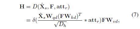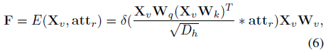 문장 embedding인 \hat{X}_{s}와 수식 (6)에서 얻은 foreground video feature F 간 cross-attention을 통해 multi-modal representation H \in{} \mathbb{R}^{M \times{} 512}를 얻게 됩니다.