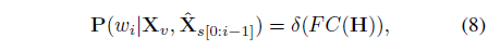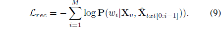 다음으로 수식 (7)은 Transformer decoder 연산을 통해 문장을 reconstruction 하는 과정입니다.