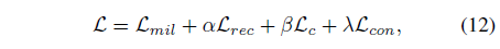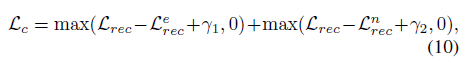 저자는 수식 (9)의 reconstruction loss를 활용한 contrastive loss \mathcal{L}_{c}도 제안합니다. 이는 아래 수식과 같습니다.
