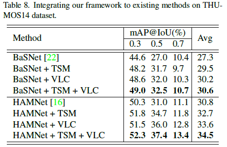 표 8은 이전 WTAL 방법론인 BaSNet과 HAMNet에 저자의 모듈을 붙이는 실험에 대한 성능입니다. 사실 저자의 두 모듈을 붙였을 때 성능이 많이 향상되긴 하지만 결국은 TSM과 VLC가 각각 모델 구조를 가지며 모델 크기가 2배가 된다고 볼 수 있기 때문에 어느정도 효율성 측면에서는 한계가 있다고 저자도 이야기하고 있습니다. 결과적으로 성능은 많이 오르긴 하네요.