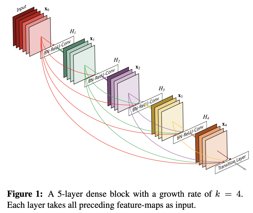 [x0, x1, ., xℓ-1]은 0, … , ℓ-1 계층에서 생성된 feature-map을 concatenate한 것입니다. 구현의 편의를 위해, Hℓ(·)의 multiple input을 하나의 텐서로 concatenate한다고 합니다.