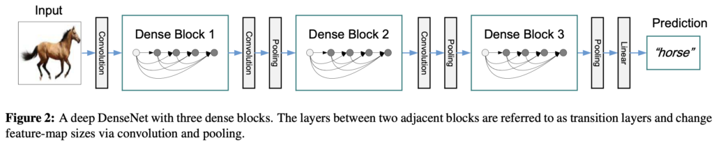 (2)번 수식의 concatenation연산은 feature-map 크기가 바뀌면 실행이 불가능합니다. 하지만, convolution network에서 feature-maps의 사이즈를 조정하는 down-sampling layer는 필수적인 부분입니다. 네트워크 구조 안의 down-sampling을 위해서, 저자들은 네트워크를 dense blocks로 나눠 구현합니다. (한 블럭 안에서 그림과 같이 dense connection이 이루어집니다) 그리고, block 사이에 convolution과 pooling을 수행하는 transition layers를 배치합니다. 실험에 사용된 transition layers는 배치 정규화, 1×1 convolution layer, 2×2 average pooling layer로 구성되었습니다.