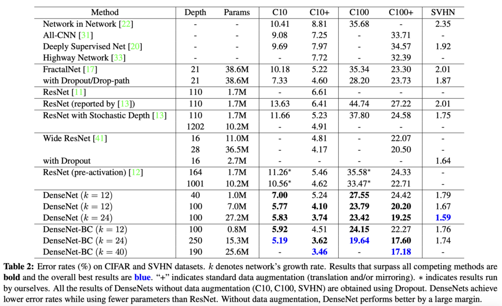 DenseNet은 CIFAR10, CIFAR100, SVHN, ImageNet 4가지 벤치마크 데이터셋에서 평가되었고, 기존 알고리즘보다 훨씬 적은 파라미터로 더 좋은 성능을 달성했다고 합니다.