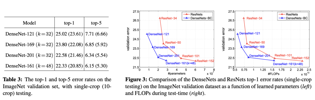 ImageNet 데이터셋에 대한 실험 결과입니다. Figure3을 보면 동일한 validation error에 대해 DenseNet의 파라미터 수가 ResNet의 파라미터 수보다 상당이 작은 것을 볼 수 있습니다. ResNet도 이전 모델보다 상당히 깊게 쌓을 수 있었는데, DenseNet은 ResNet보다도 훨씬 깊으면서 동시에 파라미터 수도 적게 구현될 수 있었습니다.