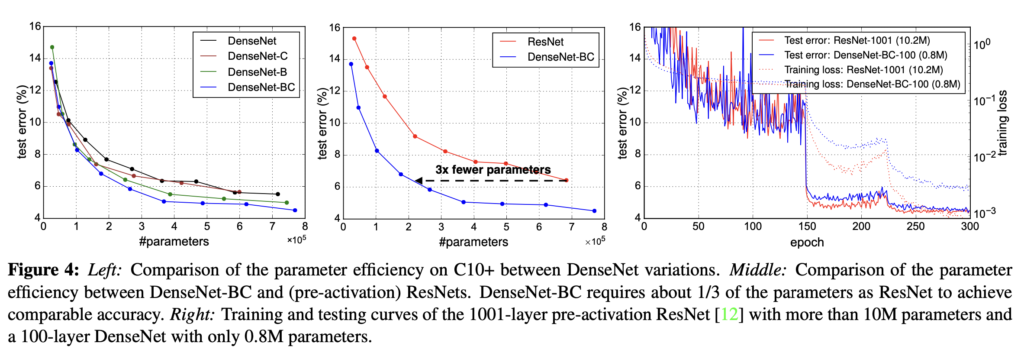 파라미터 효율성 이외에도 , DenseNet 의 장점으로는 네트워크 전체의 정보 흐름이 개선되어서 학습이 훨씬 용이하다는 것입니다. 각 계층은 loss function으로부터의 gradient와 input signal에 직접 접근할 수 있어서 학습에 강점을 보인다고 합니다. 추가적으로 저자들은 dense connection의 regularizing effect까지 관측해서 작은 training set의 overfitting을 막을 수 있었다고 합니다 (구체적으로 어떻게 regularizing effect를 확인한건지 찾아보았는데 그에 관련된 추가적인 설명은 못 찾았습니다..)