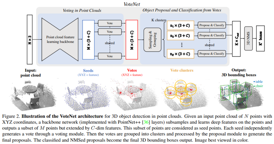 위에서 언급하였듯이 hand crafted feature가 아니라 딥러닝 네트워크를 사용하여 feature learning을 할 것인데, 본 논문에서는 backbone으로 PointNet++을 사용한 것 입니다. PiontNet++이 point cloud를 input data로 사용하는 네트워크 중 여러 task에서 유의미한 성능을 보장한 바가 있기 때문에 사용한 것이라고 저자는 이야기하고 있습니다. backbone network를 지나고 나면 XYZ 좌표와 C차원의 feature vector M개를 output으로 가지게 됩니다. 즉, (3 + C) 차원의 seed point M개를 가지고 각 시드 당 하나의 vote를 생성할 수 있습니다.