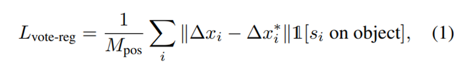 \vartriangle{x_i}는 식(1)과 같이 regression loss로 사용되는데, \vartriangle{x_i}*는 본래 x_ix_i가 속한 object의 GT Box의 중심까지의 offset을 나타냅니다. \mathbb{1}[s_i on object]는 해당 seed point가 object의 surface에 속하는지 여부를 판단하는 것이고, M_{pos}는 obejct의 surface에 속하는 모든 seed의 수를 의미합니다. 예측 offset과 GT offset의 값의 차이를 최소화하는 방향으로 Loss를 줄이면서 GT box의 center 값에 가까워지는 새로운 point가 구성됩니다.