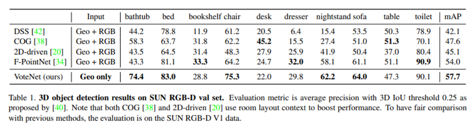 그래서 논문에서는 Hough voting 방식을 차용하여 object의 center에 가깝다고 할 수 있는 포인트를 새롭게 만들어 3D Bounding box를 만들 수 있게 하고자 하였습니다. 물론 전통적인 Hough voting 방식은 여러개의 모듈로 이루어져 있기 때문에 end-to-end 방식에 최적화되도록 수정하였는데, 이는 아래에서 더 자세하게 다루도록 하겠습니다. 저자는 해당 방법론으로 3D Object detection dataset인 SUN RGB-D와 ScanNet 두 가지 데이터셋에서 실험을 진행하여 당시 SOTA를 달성하였다고 합니다. 실험 결과를 통해 voting 방식이 object의 surface에서 centroid가 멀 때 효과적으로 context한 정보를 모아 detection할 수 있음을 증명하였다고 하네요. 결국 논문의 main contribution은 다음과 같습니다.