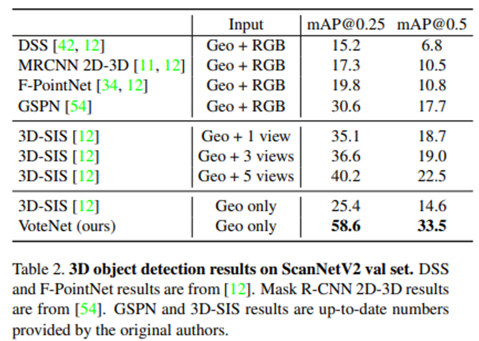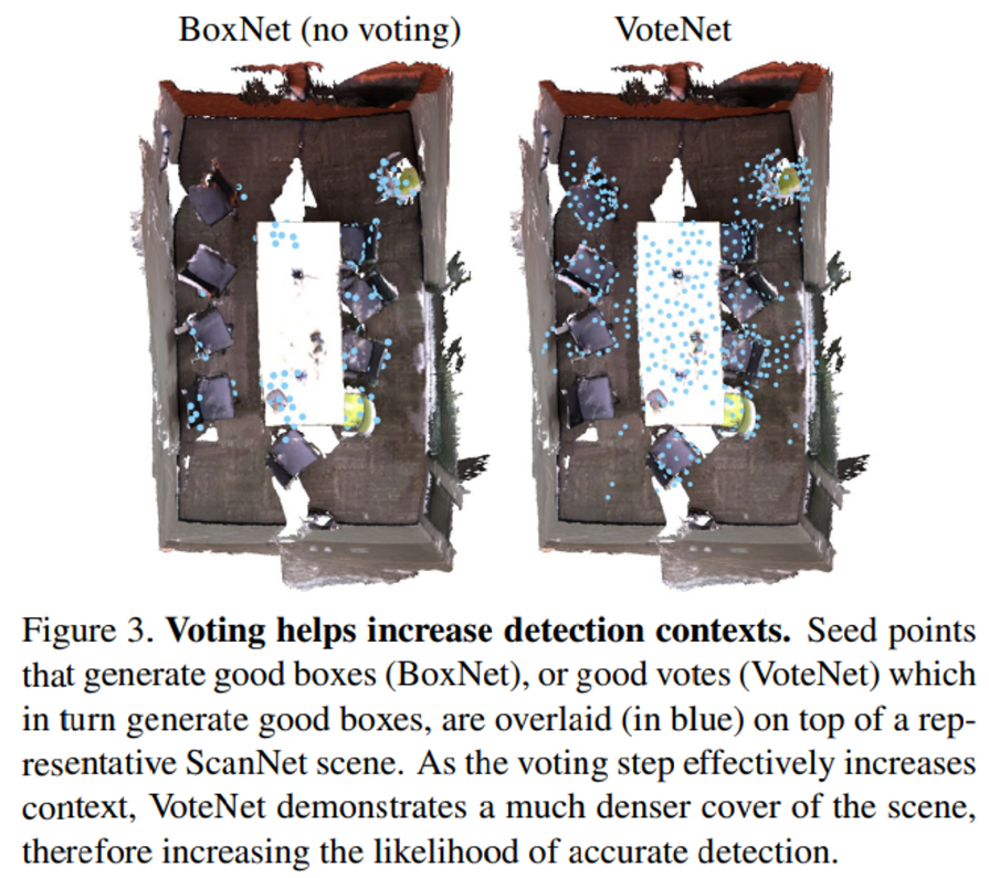 실제 ScanNet scene에서 BoxNet과 VoteNet에 bbox proposal에 사용된 point들을 시각화한 것인데, VoteNet에서 한 객체 당 더 넓은 범위에 seed point가 존재하며 box를 만들 때 필요한 context를 증가시켜줍니다.