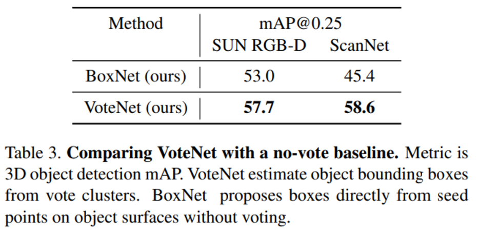 voting 여부를 확인하기 위해서 BoxNet이라는 voting을 하지 않은 baseline을 구축하여 실험하였다고 합니다. BoxNet에서의 bound box는 seed point가 구해지고 voting 되지 않은 object surface 위의 point들로 구해진 box라고 할 수 있습니다. Table 3.의 결과를 보면 두 dataset에서 모두 voting을 적용한 VoteNet이 높은 성능을 보임을 알 수 있습니다.