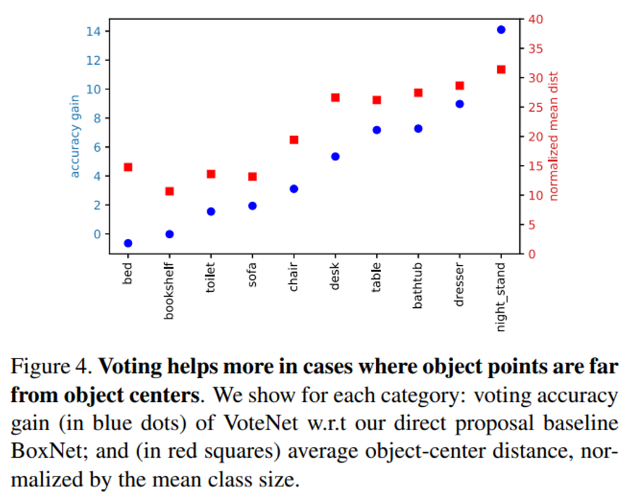 다음 Figure 4.는 SUN RGB-D dataset에서 각 class의 surface와 ceneter가 얼마나 멀리 떨어져 있는가에 따라 voting의 효과가 달라지는지를 보여주고 있습니다. 빨간색 점이 각 class마다 object와 center 사이의 거리이고 파란색 점이 VoteNet에서 voting을 한 후 성능 입니다. 전반적으로 center가 surface에서 멀리 위치해있을수록 voting 후의 결과가 좋아지고 있음을 그래프를 통해 알 수 있습니다.