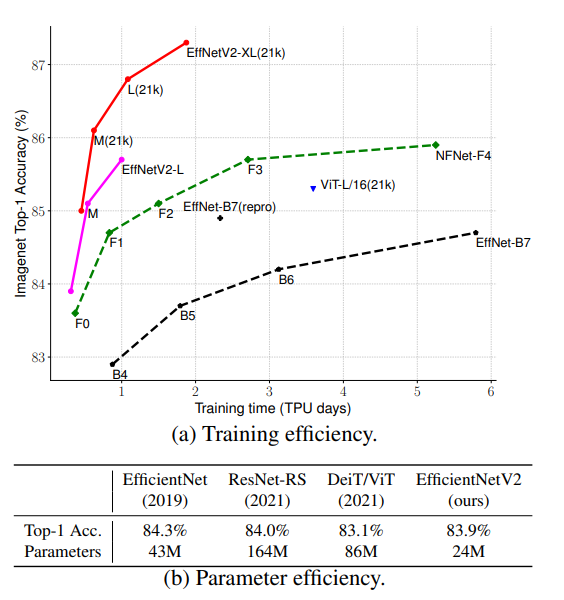 • training-aware NAS와 scaling을 통해 training speed와 parameter efficiency를 모두 확보한 모델인 EfficientVetV2를 제안