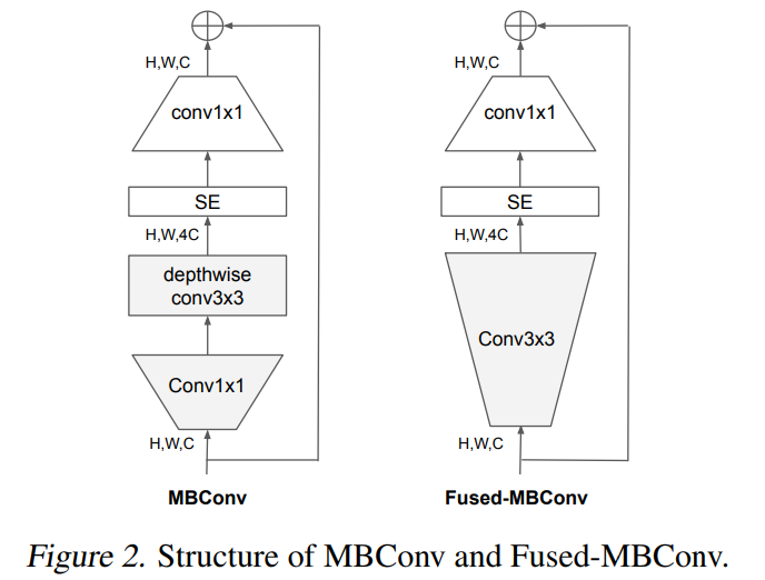 그러나 depthwise convolution은 일반적인 convolution에 비해 최신 accelerator에서 잘 동작하지 못하고 overhead가 발생하였습니다. 저자들은 이를 보완하기 위해 MBConv의 depthwise 3×3 convolution 연산을 3×3 convolution 연산으로 전환한 Fused-MBConv 블럭을 이용하였습니다.