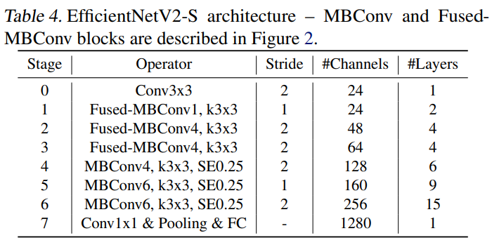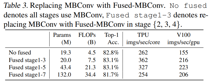 – [표4]를 보시면 뒤 stage로 갈수록 채널 수가 앞 부분에 비해 크게 증가한 것을 볼 수 있는데요, 이로 인해 뒷 레이어의 output feature의 채널 수 또한 증가함을 알 수 있습니다. 이러한 경우에는 오히려 일반적인 convolution의 연산량이 overhead가 발생한 depthwise convolution보다 크게 증가하게 되므로 모델 전체에 fused를 사용하는 것 보다 fused MBConv와 MBConv를 혼합하는 것이 더 좋은 성능을 낸 것이라고 이해하였습니다.