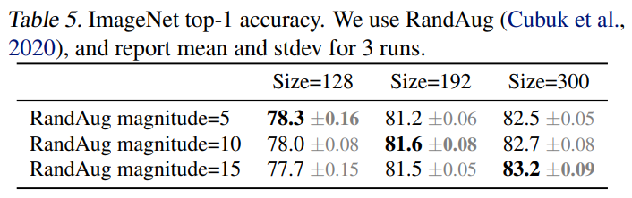 이미지의 크기에 따라 augmentation의 정도를 조절해햐 함을 보이기 위해 저자들은 하나의 실험을 진행하였습니다. [표5]는 이미지의 크기와 augmentation 정도를 달하며 실험했을 때의 accuracy를 나타낸 것으로 이미지의 크기가 작으면 약한 augmentation이, 크면 강한 augmentation이 더 좋은 결과를 보여주는 것을 확인할 수 있습니다.