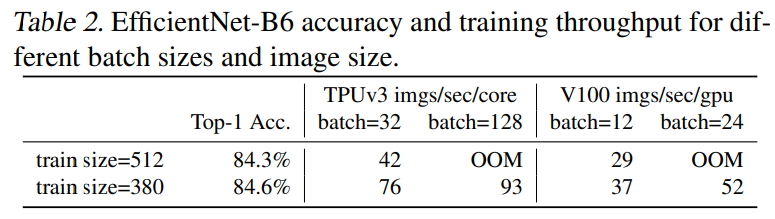 EfficientNet V1의 B0와 B7 모델은 각각 224×224와 600×600 해상도의 이미지로 학습을 진행하였습니다. CPU/GPU 메모리 등 학습 환경이 동일한 경우, 큰 이미지를 사용하면 작은 이미지를 사용하는 것에 비해 batch size가 작아지고, 이로 인해 training speed가 감소합니다. [표2]는 EfficientNetB6에 서로 다른 해상도의 이미지를 사용하였을 때 이미지 당 처리 시간을 나타낸 것으로, 이미지 크기가 512인 경우가 380인 경우보다 단위 시간동안 적은 수의 이미지를 학습한다는 것을 보여주고 있습니다.