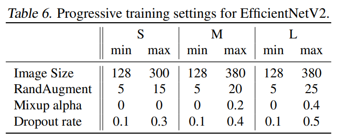 학습은 ImageNet-ILSVRC2012와 ImageNet21k로 진행되었으며 총 training epoch인 350을 네 단계로 나누어 87epoch마다 image의 크기와 regularization magnitude를 아래의 [표6]과 같이 조절하였다고 합니다.
