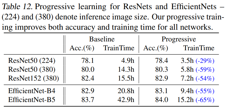 Progressive learning이 일반적인 경우에도 training efficiency를 확보할 수 있다는 것을 보여주기 위해, EfficientNetV2이외의 모델에 progressive learning을 적용하며 training time을 비교하였습니다. [표12]를 통해 Progressive learning을 사용한 경우 학습 시간이 크게 줄어든 것을 확인할 수 있습니다.
