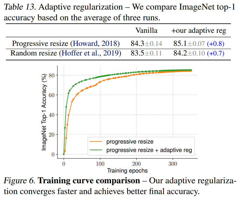 저자들은 마지막으로 이미지의 크기에 따라 regularization의 강도를 조절하는 adaptive regularization의 중요성 또한 실험을 통해 증명하였습니다. 일반적으로 augmentation을 위해 이용하는 random resizing과 이미지의 크기를 점차적으로 키우는 progressive resizing에 각각 adaptive regularization을 적용한 후 결과를 비교하였습니다.