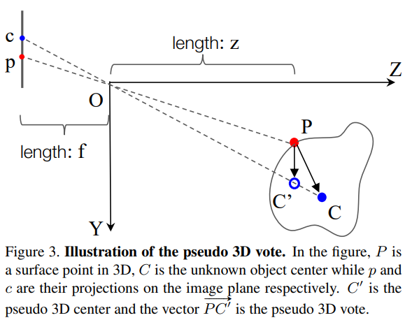 이제 Fig3을 보면서 어떻게 1D에서 center을 찾을 수 있는 것인지 알아보도록 하겠습니다. Fig3에서 왼쪽이 image plane의 2D bounding box이고 오른쪽이 3차원 공간의 3D Object로 C는 3D Object의 center point, P는 object 표면 위의 점 입니다. image plane 위의 c, p는 각 PC가 projection된 점들로 Figure1와 같은 형태를 이루게 됩니다. 여기서 image vote를 알고 있으면 3차원 공간에 존재할 center point C’를 1차원 ray OC 위에서 찾을 수 있습니다. 그렇다면 3D seed point에 추가해줄 ray 정보는 어떻게 구할 수 있을까요?