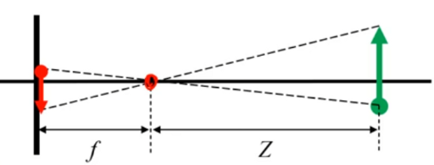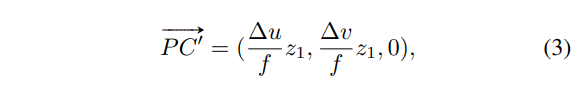 이미지 차원에서 중심 c와 pixel p와의 거리를 구하면 (u_2 - u_1, v_2 - v_1)이고 이를 위에서 pinhole camera로 가정하고 카메라의 내부 파라미터를 이용한다고 언급하였듯이, focal length f를 가진 pinhole camera라고 가정하였기 때문에 위의 삼각비를 표현한 그림을 토대로 생각을 해보면 식(2)같이 정의할 수 있음을 알 수 있습니다. 여기서 새로운 가정을 하나 더 추가할텐데요, 물체의 표면 위에 존재하는 포인트인 P의 depth와 center point C의 depth가 비슷하다고 가정하는 것 인데 이는 카메라와 물체가 너무 가까이 있는 경우가 아닐 때 합리적인 가정이라고 합니다.
