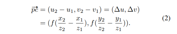 pinhole camera의 3D-2D transformation을 생각해보며 P를 카메라 좌표계 P = (x_1, y_1, z_1), p와 c를 이미지 좌표계로 p = (u_1, v_1), c = (u_2, v_2)로 정의해보겠습니다. 찾고자 하는 것이 GT object center C = (x_2, y_2, z_2)와 가까워지는 vote point C’를 찾는 것으로 실제 seed point P와 C의 차이는 식(1)과 같습니다.