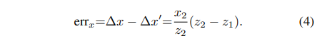 식(4)는 x 방향에 대한 error 식으로 y 방향에 대해서도 동일하게 구할 수 있습니다. 만약 이렇게 OC에 (x_2/z_2, y_2/z_2)라는 방향 정보를 준다면 실제 GT center의 depth z_2와 pseudo vote point C’의 depth z_1 차이를 구하기 위해서 추가적인 정보가 필요할 것 입니다.