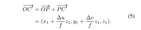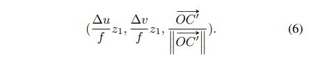 그러나 실제 3차원에서 object center인 C를 알 수 없기 때문에 식(5)처럼 OC를 대신해서 OC와 같은 방향인 OC’의 방향을 사용하게 되죠.