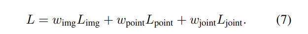 본 논문은 총 3가지의 타워를 제시하는데 Figure2에서 point tower, image tower, joint tower로 앞의 두 tower는 train에서만 사용하며 joint tower의 경우에만 inference에서까지 사용한다고 합니다. image tower의 경우 semantic cues와 texture cues, 즉 image feature만으로는 3D bounding box proposal을 수행할 수 없기 때문에 앞서 이야기한 것처럼 pseudo 3D votes를 생성할 수 있도록 seed point를 제공하게 됩니다. 결국 image tower의 input은 3D 좌표와 2D feature가 될 것이고 pseudo 3D vote point와 semantic, texture cues를 통해서 3D box proposal이 가능합니다. point tower는 3D 좌표와 3D feature가 input으로, joint tower는 모든 좌표와 feature가 모두 input으로 들어가게 됩니다. 그래서 3개의 각 tower에 가중치를 부여한 전체 Loss는 식(7)로 정의할 수 있습니다.