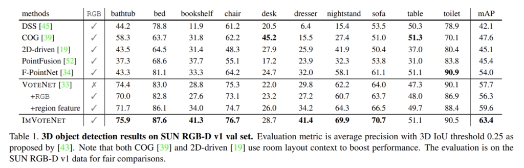 Table1은 이전의 RGB+point cloud를 사용하는 방법론들과 당시 SOTA 방법론인 VoteNet과의 비교로 진행을 하였습니다. 방법론의 우수함을 강조하기 위해서 VoteNet을 확장한 2개의 베이스라인을 더 설정하였습니다. 먼저 +RGB라고 표시되어 있는 baselien은 RGB 세 개의 픽셀 값을 3차원 벡터로 표현하여 point cloud처럼 seed point로 사용한 것이고, +region feature는 본 논문의 semantic cues처럼 region level의 one-hot class confidence feature을 seed point로 함께 사용하였습니다. 실험이면서 동시에 ablation study를 수행하는 느낌으로 진행한 것 같습니다 ..