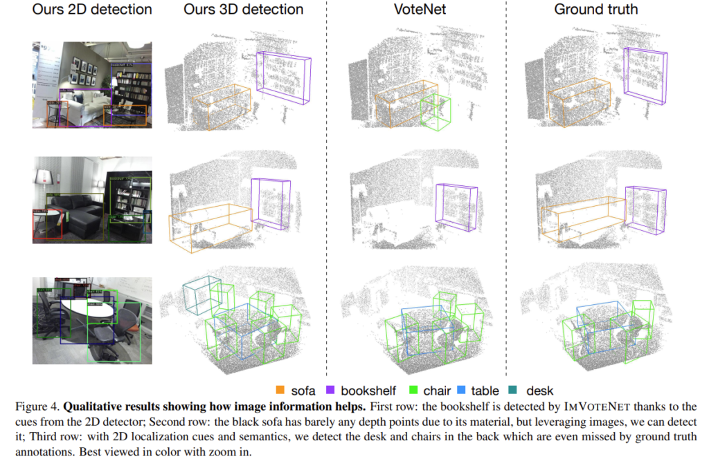 Figure4는 실험 결과를 정성적으로 보여주는 것으로 첫번째 행과 두번째 행에서 기존의 VoteNet에서는 검출하지 못하던 bookshelf나 sofa를 detection하고 VoteNet에서 FP로 검출되던 chair 또한 사라져 있는 것을 확인할 수 있습니다. 심지어 마지막 행을 보게 되면 dataset에서 GT로 설정한 object 이외에 2D image에서 검출된 나머지 chair나 desk까지 검출하면서 2D image를 사용하는 것의 효과를 강조하고 있습니다.