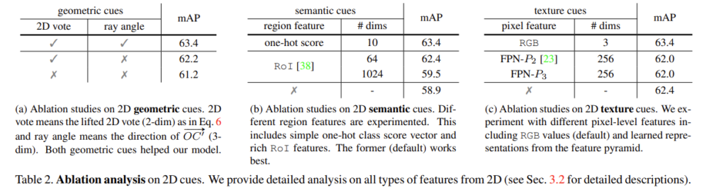 먼저 Table2.(a)를 보면 1행과 3행을 비교하였을 때 2D vote를 사용하지 않았을 경우 사용한 결과 대비 2.2%의 성능 하락을 보이고 있습니다. 앞서 이야기하였듯이 ROI pooling feature가 아닌 one-hot score을 사용하여 경량화를 시도하였고 차원을 보았을 때 ROI Pooling feature가 1024, 64차원인 것에 비해 one-hot score는 dimension이 10으로 훨씬 적은 차원이지만 mAP를 비교해보면 가장 높은 성능을 달성하며 작은 차원으로 높은 성능을 보일 수 있음을 입증하였습니다. 마지막으로 다른 pixel level의 feature와 비교했을 때 RGB row pixel 정보를 texture cues로 사용하는 것에 대한 실험 결과 입니다. 비교군으로 가져온 다른 pixel feature들은 overfitting 되어 오히려 어떤 feature도 texture cues로 사용하지 않았을 때보다 낮은 성능을 보입니다. 즉 3개의 cues는 RGB image와 point cloud를 함께 사용하는 ImVoxelNet의 성능을 향상시키는 데 기여하는 것을 확인하면서 리뷰 마치도록 하겠습니다.