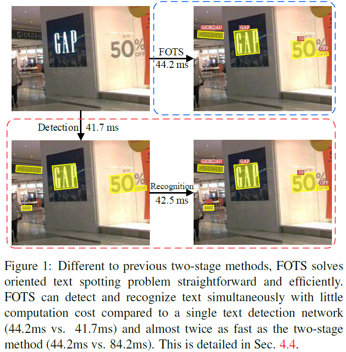본 논문이 게재된 2018년을 기준으로 이전 대부분의 방법론들은 detection과 recognition을 구분해서 2개의 분리된 task로 바라보았습니다. 그렇기 때문에 해당 방법론들의 모델은 detection과 recognition을 수행하는 모델을 따로 구성하는 방식이였고, detection과 recognition 학습 과정에서 서로가 주고 받을만한 시각적인 공통적 특징들을 무시한다는 한계점이 존재하죠. 그리고 end-to-end 학습도 불가능하구요.