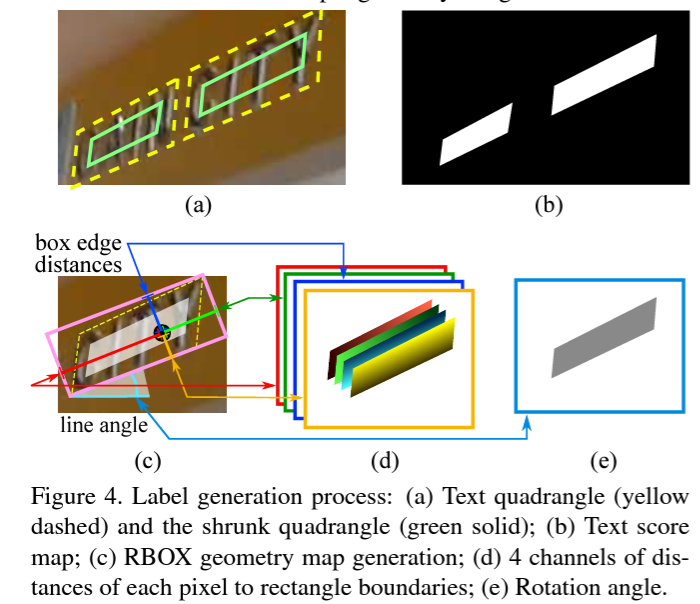 결론적으로 위 식을 통해 학습 데이터 셋의 gt bbox에 대해 1대1로 매칭되는, 실제 text 가 존재하는 positive 영역을 만들 수 있게 되고 이를 binary mask 형태로 시각화 한 것이 그림 4-(b) 입니다.