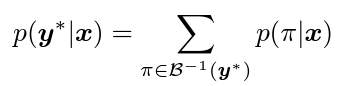 우선 CTC 알고리즘을 통과한 최종 output은 S라는 전체 character 수에 대한 확률을 채널축으로 가지는 어떠한 확률분포일것입니다. 이를 x라고 하고, gt label을 y^*라고 했을 때 y^*에 대한 조건부 확률을 아래 형태로 정의할 수 있습니다.