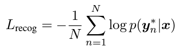 그리고 식 6을 사용해서 이의 log likelihood의 합을 최대화하는 방향으로 학습을 진행하도록 설계한 recog loss가 식 7입니다.