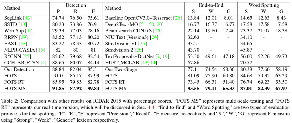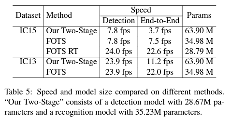 저자들이 제안한 FOTS 방법론은 기존의 Detection Encoder와 Recognition Encoder를 하나로 통합함으로써 모델의 parameter 수와 speed 측면에서 2배 가량의 향상을 이루었습니다.