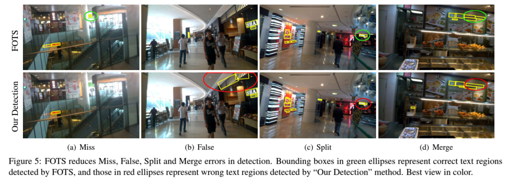 3. 이 부분은 제 리뷰 중 그림 11의 정성적 결과에 대한 설명을 참고하시면 될 거 같습니다. 결론을 말씀드리면 EAST와 FOTS가 같은 Detection 모델 구조라고 할 지라도 East의 Encoder는 Detection Loss만을 사용해서 backward 계산이 수행되지만, FOTS의 Encoder는 Detection & Recognition Loss를 함께 사용해서 backward 계산이 되죠. 그렇기 때문에 더 복합적인 정보로 상세한 표현력 & 학습을 수행할 수 있는 것입니다.