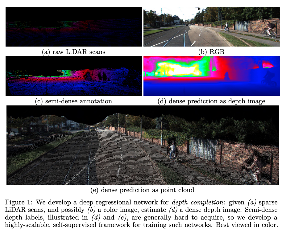 Depth completion은 Fig 1-(a)과 같이 LiDAR의 sparse한 특징으로 인해 드물게 측정된 깊이 정보들을 조밀한 깊이 정보로 만드는 기술로, 자율 주행 및 로보틱스 분야에서 유용하게 사용될 수 있는 기술 중 하나 입니다. 저자는 해당 기술을 고도화 시키기 위해서는 다음과 같은 3가지의 문제를 해결해야 한다고 합니다. 첫째, LiDAR 측정값은 매우 희소하고 이미지 공간에서의 간격도 불규칙합니다. 둘째, 깊이와 색상은 서로 다른 센서 방식이기 때문에 가능한 경우 해당 컬러 이미지를 사용하여 예측 정확도를 개선하는 것은 간단한 작업이 아닙니다. 셋째, 일반적으로 정밀한 GT를 사용하기 힘듭니다. 이는, 픽셀 수준 주석을 얻는 것은 노동력이 매우 많이 들며 현실적으로 정밀한 측정이 어려운 문제가 있습니다.