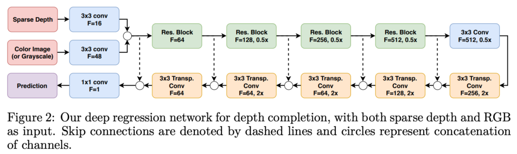 Sparse depth와 컬러 이미지를 입력으로 사용 가능한 경우 각각 개별적인 컨볼루션을 통해 처리됩니다. 각각 처리된 특징 정보들은 연결(concatenated)되며, 이는 ResNet-34의 residual block로 구성된 인코더에 입력 되어집니다. 각 인코딩 레이어의 출력값들은 skip-connection을 통해 동일한 크기 혹은 레벨의 디코딩 레이어로 전달됩니다. 마지막으로 최종 1×1 컨볼루션은 네트워크 입력과 동일한 해상도의 단일 예측 이미지를 생성합니다. 모든 컨볼루션은 마지막 레이어를 제외하고 batch normalization 및 ReLU가 사용합니다.