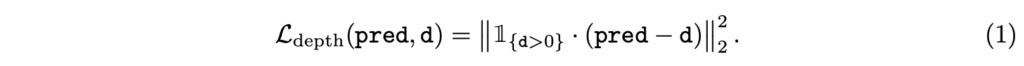 Sparse Depth Supervision. sparse depth d1 자체를 지도 학습을 위해 사용합니다. 구체적으로, 정확하게 알고 있는 희소 깊이 정보를 이용하여 해당하는 픽셀에서의 예측된 조밀한 깊이 정보에 대한 아이덴티티 매핑을 수행합니다. 이러한 손실은 정확도를 높이고 안정성을 개선하며 학습을 위한 빠른 수렴으로 이어집니다. depth loss는 다음과 같이 정의됩니다.