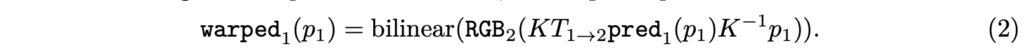 Photometric Loss as Depth Supervision. Relative transformation T1→2와 현재 깊이 예측 pred1이 주어지면 주변 컬러 이미지 RGB2를 현재 프레임에 역으로 warping이 가능해집니다 . 구체적으로 카메라 고유 행렬 K가 주어지면 현재 프레임 1의 모든 픽셀 p_1 은 프레임 2에서 p_2 = KT_{1 \rightarrow 2}pred_1(p_1)K^{-1}p_1 로 해당 투영을 갖습니다. 따라서 p_2 의 이웃 4개를 중심으로 이중 선형 보간을 사용하여 합성 컬러 이미지를 생성할 수 있습니다. 이를 정리하면 아래와 같습니다.