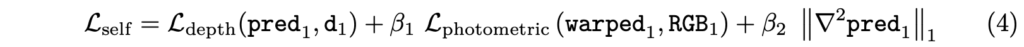 Smoothness Loss. Photometric loss는 인접 제약 없이 모든 개별 오차(즉, 각 픽셀에서 독립적으로 계산된 색상 차이)의 합계만 측정합니다. 따라서 측광 손실만 최소화하면 일반적으로 깊이 픽셀의 값이 부정확하고 불연속성이 높은 로컬 최적값이 생성됩니다. 이 문제를 완화하기 위해 손실 함수에 세 번째 항을 추가하여 깊이 예측을 원활하게 합니다. 깊이 예측의 2차 미분의 L1 손실인 \lVert \nabla^2 pred_1 \rVert_{1} 를 페널티로 부여하여 패치 단위의 depth prediction을 수행하도록 유도합니다.