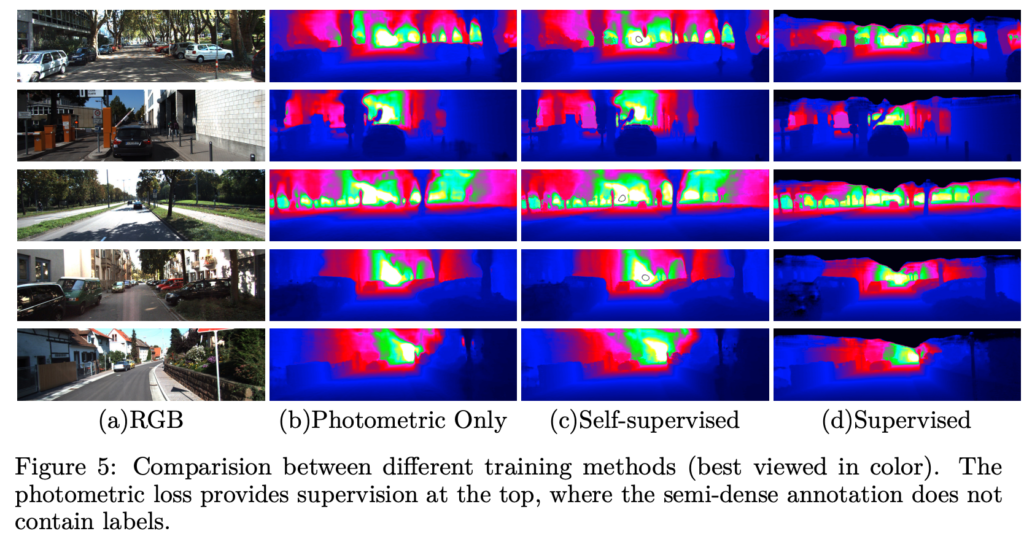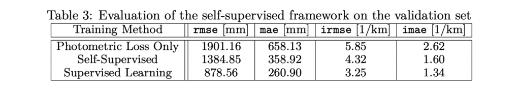 Tab 1에서 해당 방법론을 제외하면 다른 방법론들은 지도 학습에 해당합니다. 그런데도 불구하고 꽤나 큰 성능 차이를 보여주고 있습니다. 이에 대해 저자는 지도 학습에 사용되는 LIDAR의 semi-dense depth에서 LiDAR에서 측정되지 않은 부분들은 0 값을 보유하고 있어 해당 정보들을 모두 0으로 학습하기 때문에 모델이 제대로된 학습이 불가능하기 때문이라고 이야기합니다.