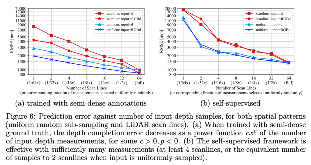 자기 지도 프레임워크는 64라인 라이다 측정 뿐만 아니라 저해상도 라이다와 더 희박한 깊이 입력에도 효과적인 결과를 보여 줍니다. fig 6-(b)는 깊이의 희소성 수준에 따라 자기 지도 학습 프레임워크로 훈련된 모델의 검증 오류를 보여줍니다. 입력값의 수가 너무 적으면 검증 오차가 커지는 결과를 보여줍니다. 이는 PnP 포즈 추정에 실패하기 때문에 발생되는 현상입니다. 그러나 충분히 많은 측정값이 있으면 유효성 검사 오류는 semi-dense GT를 사용한 모델과 유사하게 입력의 거듭제곱함수로 감소하기 시작합니다.