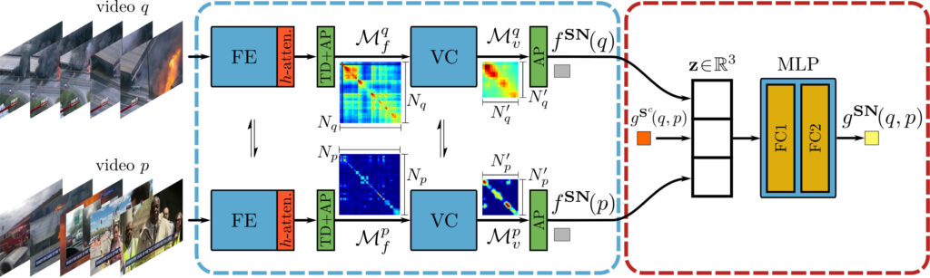 $SN$은 비교할 두 영상의 self-similarity와 $S^c$가 계산한 유사도 $g^{S^c}$를 입력받아, MLP 구조의 신경망을 통해 $S^f$를 사용할지를 판단합니다. 이 MLP는 학습 단계에서, coarse-grained student로 계산한 유사도 $S^c$와 fine-grained student로 계산한 유사도 $g^{S^f}$가 임계값 0.2 이상으로 큰 영상들을 분류하도록 이진 크로스 엔트로피로 학습됩니다.