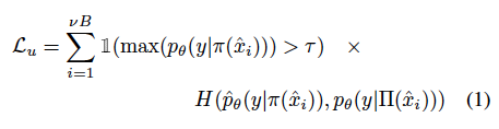 \gamma는 위에서 말한 confidence threshold를 의미하며, \phi와 Π는 weak, strong augmentation을 의미합니다. 아, 추가로 H(p, q)는 확률분포 p, q 사이의 cross entropy 를 의미합니다.