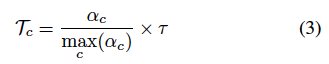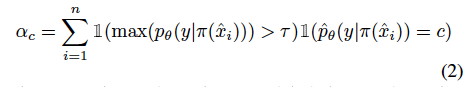 그래서 FlexMatch는 이름에서처럼 유연한 threshold를 설정하기로 하였습니다. 가령 고정된 threshold값이 아닌 샘플 개수가 적은 클래스는 학습 난이도가 높다고 판단하여 threshold를 adaptive 하게 낮춤으로써 학습 샘플을 더 많이 선택할 수 있게 변경합니다. 계산하는 법은 간단합니다. 클래스 c에 대한 학습 상태 \alpha_c는 클래스 c에서 예측되고 고정 threshold \gamma를 통과하는 라벨링되지 않은 수로 계산이 간단하게 가능해집니다. 그리고 클래스 c에 대한 임계값 T를 구하는 건 아래 수식 (3) 과 같습니다.